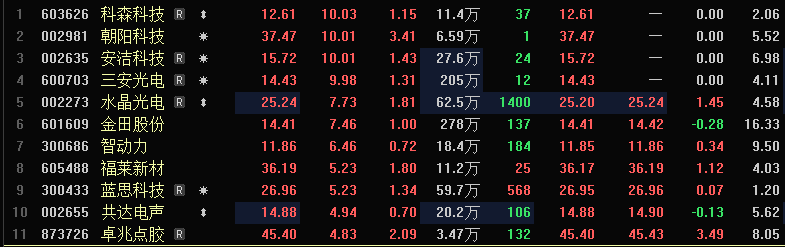 个股亦是集体飙升。科森科技、朝阳科技、安洁科技、三安光电封板,蓝思科技、共达电声表现强劲。香港市场舜宇光学大涨超6%。