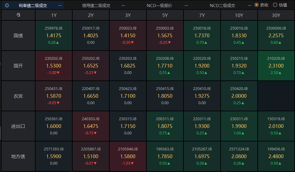 截至今日18点,利率市场收益率多数小幅上行,1Y国债上行0.26bp至1.42%,3Y国债下行0.25bp至1.42%,5Y国债下行0.5bp至1.57%,10Y国债上行0.3bp至1.83%,30Y国债上行0.6bp至2.26%,10Y国开上行0.5bp至1.93%。信用市场收益率多数大幅上行,2Y期AAA信用债上行2bp至1.89%,3Y期AAA信用债上行3.54bp至2.33%,5Y期AAA信用债上行2bp至2.21%。转债方面,中证转债指数今日收盘报484点,收涨0.40%。